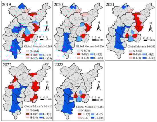 When , it indicates that the spatial distribution is random, when , it indicates that similar values are spatially clustered, and when , it indicates that similar values are spatially dispersed. Through the calculation of the local Moran’s index, spatial units can be divided into five spatial correlation modes, namely “H-H” promotion area, “H-L” radiation area, “L-H” transition area, “L-L” low-level area, and “N-S” insignificant area.