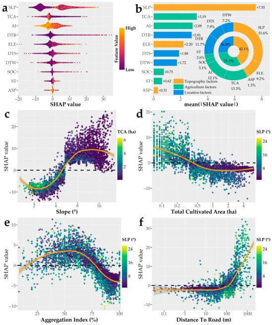 As shown in Figure 10, the formation of abandoned land was influenced by multiple factors, with agricultural and topographic factors having the greatest explanatory power, accounting for 42.1% and 31.1%, respectively. The impact of locational factors on abandoned land was smaller, with a proportion of 26.8%. Specifically, the slope (SLP) among topographic factors, the total cultivated area (TCA) and aggregation index (AI) among agricultural factors, and the distance to road (DTR) among locational factors had the greatest impact, with average SHAP values of 7.55, 3.19, 2.88, and 2.81, respectively. Soil organic carbon (SOC), soil type (ST), and aspect (ASP) had the least explanatory power for abandoned land, with average SHAP values all below 1. The interaction plots show that abandoned land is significantly influenced by the coupling of topographic and agricultural factors, with the slope having strong interactions with multiple factors. When the slope is less than 6° and TCA is large, the slope has a negative impact on AR. However, when the slope is greater than 6°, AR increases with both an increase in slope and a decrease in TCA, indicating that fragmented cropland on steep terrain poses significant negative impacts on agricultural production. TCA shows a strong positive response to AR when it is below 0.4 ha; however, above 0.4 ha it suppresses AR, with this effect stabilizing at a relatively constant level. As AI increases, AR decreases, and when it reaches a threshold of around 75%, its effect on abandoned land shifts from a positive to a negative response, indicating that cropland patches with higher connectivity have a lower likelihood of abandonment. DTR shows a slight negative response to AR when it is below 200 m, but as DTR exceeds 200 m, there is a significant positive response, which strengthens with increasing DTR, suggesting that accessibility to transportation is a key factor influencing AR.