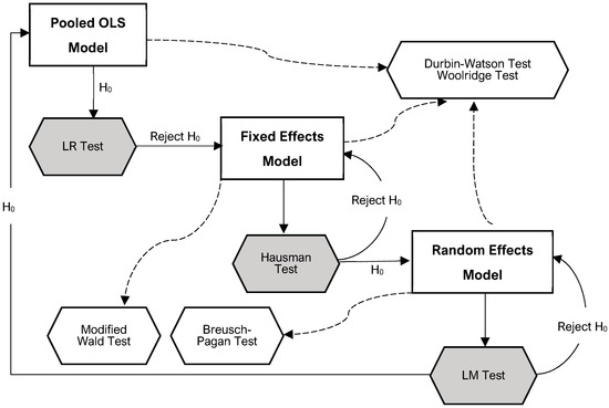 Model selection was undertaken systematically to identify the most appropriate specification for each dependent variable. Figure 1 describes the panel regression model selection process conducted in this study to determine the most robust models for the analysis. The panel regression modeling started with the estimation of the common effects or pooled OLS model and the fixed-effects model. Following Fauziyyah and Duasa [81], the likelihood ratio (LR) test was employed to select between the two models. A significant test statistic (p < 0.05) indicated a rejection of the null hypothesis that the pooled OLS is better than the fixed-effects model, thereby favoring the latter model. If the fixed-effects model was selected, the Hausman test was subsequently applied to compare the fixed-effects and the random effects models. A significant result (p < 0.05) supported the fixed-effects model, while a non-significant result indicated the random effects model was more appropriate. For cases where the random effects model was selected, a Lagrange Multiplier (LM) test was further conducted to assess its suitability compared to the pooled OLS model. The random effects model is chosen if the null hypothesis of pooled OLS model in the LM test is rejected.