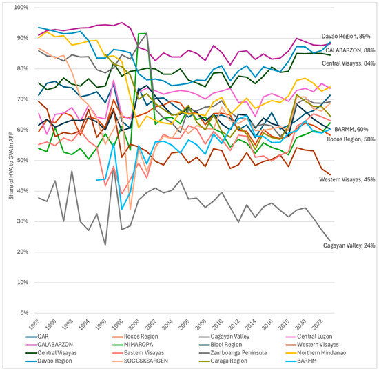 Share of HVA output to the total GVA in AFF by region, Philippines, 1988–2023. Note: Share of HVA computed as GVA in AFF less the total value of production of low-value traditional crops (rice, corn, sugarcane and coconut) divided by GVA in AFF. Source of basic data: PSA [1].