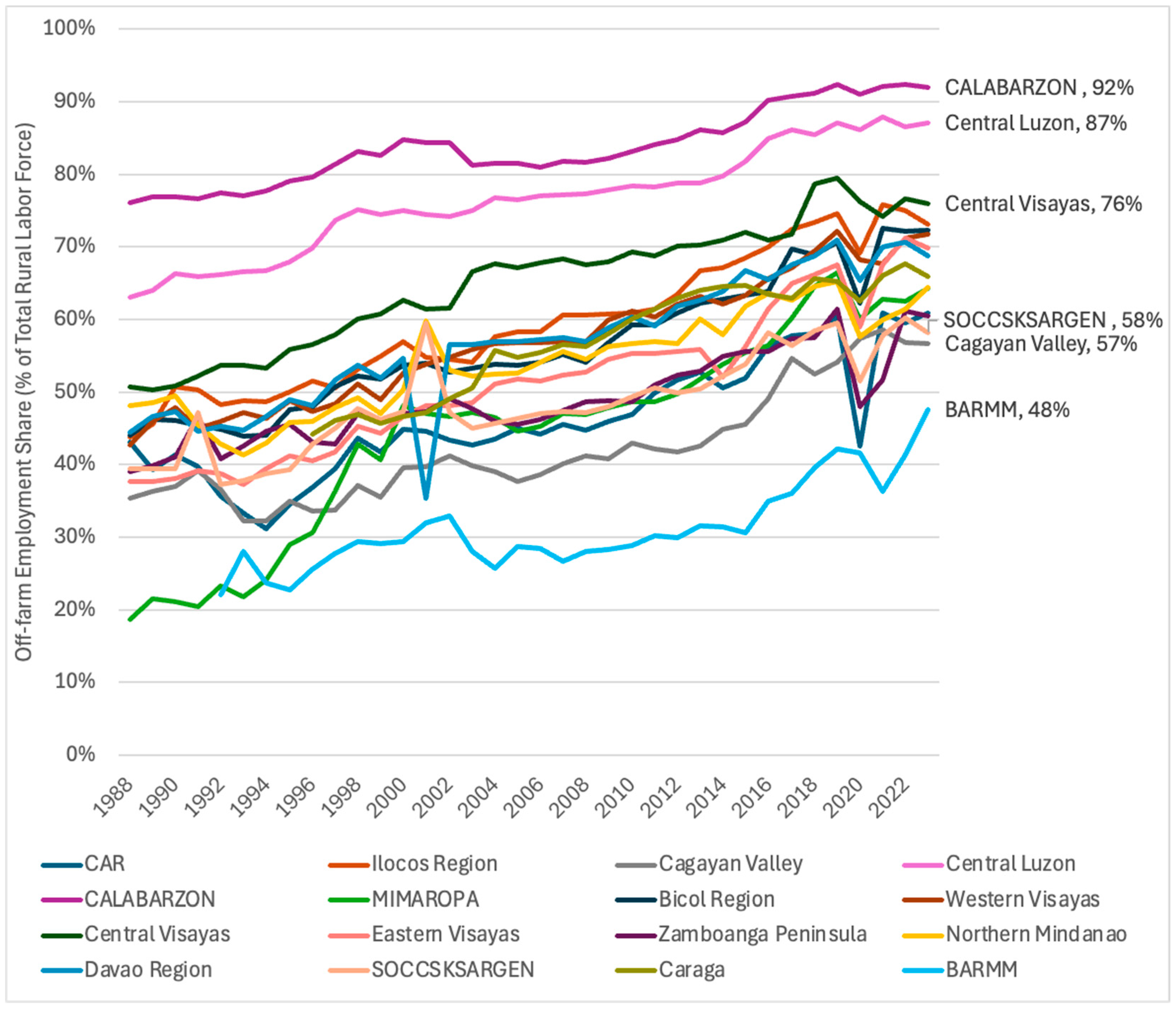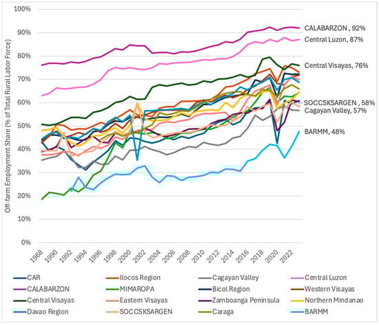 Off-farm employment share to the total rural labor force by region, Philippines, 1988–2023. Note: Share of off-farm employment was computed as [(total rural labor force (LF) − total agricultural employment)/total rural LF] × 100; where the rural LF was calculated as [total LF × rural–urban LF ratio]. Source of basic data: PSA [1].
