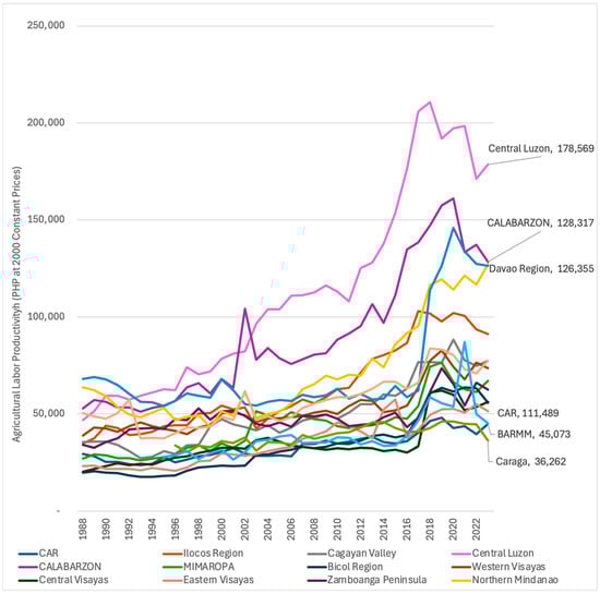Finally, we looked into agricultural labor productivity performance to further assess rural transformation across regions. Agricultural labor productivity is the amount of AFF output produced by each employed person. A region with a relatively high level of agricultural labor productivity suggests that it has made significant progress in terms of rural transformation. In the Philippines, increasing levels of agricultural labor productivity are generally observed for the 1988–2023 period, suggesting that there has been a continuous progress in rural transformation across regions (Figure 4). However, the pace of the productivity growth differs across regions, with the highest agricultural productivity being recorded at PHP 469,684 (equivalent to approximately USD 7975) in Central Luzon and the lowest at PHP 110,386 (US$ 1874) in the region of Caraga. Only 31% of the sixteen regions achieved an agricultural labor productivity above the national average of PHP 81,185 (USd 1378) in 2023.