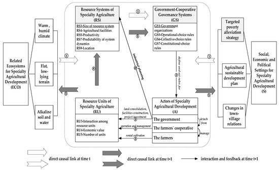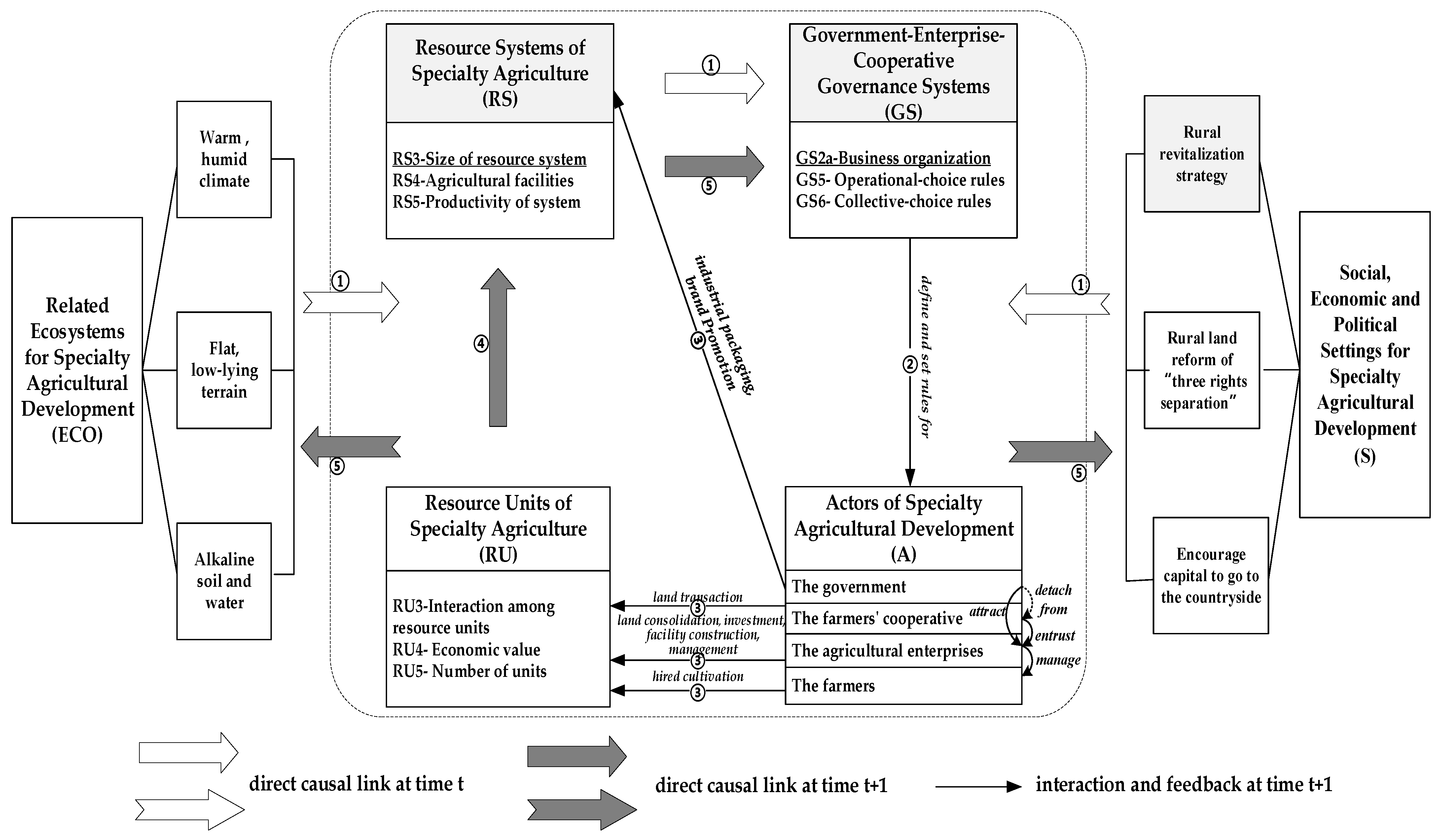 Our study adapts the SESF with additional focus on its dynamic flows to explore how interactions between governance subsystems and land resource subsystem change over the course of specialty agriculture development and associated implications of such transitions. According to SESF (see