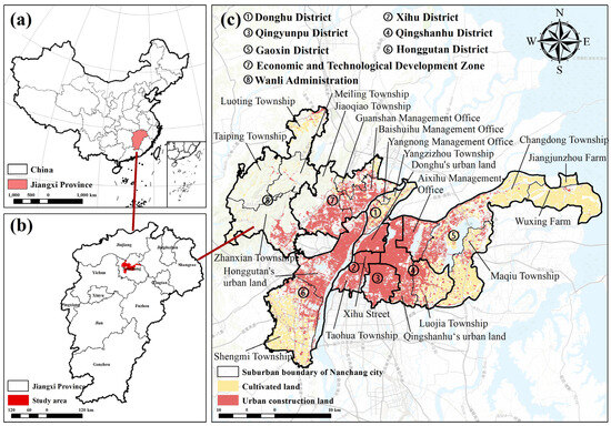 The Nanchang suburbs represent a collection of the main urban area and suburban spatial entities situated close to the main urban area. These areas are characterized by a higher degree of urbanization. It is situated in the middle eastern part of China, the north central region of Jiangxi Province, and the northwestern part of central Nanchang. It is located downstream of the Gan River and the Fu River as well as on the southwestern shore of Poyang Lake (28°29′–28°55′ N, 115°36′–116°20′ E). The entire region has a humid subtropical monsoon climate, with most of the area comprising plains. It has superior water and heat regulation and is suitable for crop growth. As of 2022, the total area of cultivated land in the suburbs of Nanchang is approximately 20,874.00 hectares, of which 15,933.06 hectares is paddy land and 4940.94 hectares is other types of cultivated land. The proportions of cultivated land and urban construction land were the highest, except for forest land. This makes Nanchang an important base for food production in the Jiangxi Province. With the urban expansion of Nanchang, the quantity and quality of peri-urban cultivated land have tended to exhibit a progressive decline. People’s demand for diversified cultivated land is growing, and the multifunctional total amount and structure of cultivated land have undergone a major transformation; therefore, the selection of Nanchang peri-urban cultivated land as a research case has a certain typicality and practical value (Figure 1).