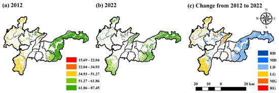 We used the natural breakpoint method to grade multifunctional changes in cultivated lands. This entailed dividing the negative-value interval into three levels, that is, rapid decline (RD), medium decline (MD), and low decline (LD), and the positive-value interval into three levels—namely, low growth (LG), medium growth (MG), and high growth (RG). The results demonstrate a decline in the multifunctional composite score of cultivated land in the suburbs of Nanchang City, from 54.67 in 2012 to 49.62 in 2022. Most of the cultivated land exhibited a downward trend, with the range of low-value areas expanding. The peripheral areas of Nanchang City, including the central and southern regions of the Gaoxin Zone, northern Honggutan District, and southern Jingkai District, are experiencing a more pronounced decline. These areas are predominantly typical cultivated lands that survived the urbanization process after being transformed into land for urban construction. They face a series of challenges, including unsustainable agricultural production, insufficient use efficiency, and soil pollution. The quality and function of these lands have been affected to varying degrees. Conversely, the multifunctional integrated level of a limited number of cultivated lands in Donghu District, the southern part of the Wanli Administration, the western part of Qingshan Lake District, and the southern part of Honggutan District demonstrated a medium- to high-speed growth trend.