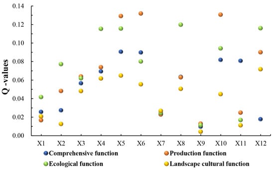 An optimal parameter-based geographical detector was used to calculate the influence value (q) of each influencing factor on the multifunctional changes in peri-urban cultivated land in Nanchang City. All factors passed the 1% significance level. The degree of influence of each factor on the functional changes in peri-urban cultivated land in Nanchang City is illustrated in Figure 7.