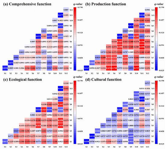Following the completion of multiple covariance analyses, we identified 12 indicators that could serve as factors for measuring the multifunctional impact of urbanization on cultivated land. In terms of spatial urbanization, changes in the nighttime light index (X1) and built-up area ratio (X2) were used to quantify the use of urban land resources and the expansion of urban space. Four indicators were selected to measure economic urbanization. These were change in GDP (X3), change in the proportion of the tertiary industry structure (X4), change in the ratio of tertiary industry output to secondary industry output (X5), and change in the per-capita disposable income of urban residents (X6). The aim was to reflect the level of economic development and upgrade the industrial structure in this new type of urbanization. Regarding population urbanization, two indicators, namely, the change in population density (X7) and the change in the proportion of the urban population (X8), were selected to measure the degree of agglomeration of population migration in new towns. In the context of social urbanization, four indicators were used—that is, change in road network density (X9), change in public green space per capita (X10), change in commercial and service prosperity (X11), and change in the number of neighborhood committees (X12), which were selected to measure the urbanization process of each region in terms of infrastructure construction, public services, and ecological space.