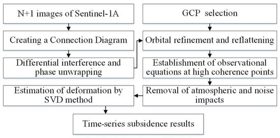 Sentinel-1A data were manipulated using SBAS-InSAR technology to extract time-series subsidence data based on ENVI5.6 SARscape software []. The basic idea of the SBAS-InSAR technique is to efficiently inhibit the errors brought about by spatio-temporal incoherence and atmosphere delay. The SBAS-InSAR technique divides the acquired SAR images into several combinations of narrow baseline datasets and sets reasonable temporal and spatial thresholds to obtain interferograms with good coherence. The interference pattern within the narrow baseline grouping is then subjected to differential interferometry, filtering, and phase untangling. Time-series subsidence was calculated using the singular value decomposition (SVD) method [], and the base mining subsidence data for 2019, 2020, and 2021 were obtained for simulation. This method is applicable for the extraction of mining subsidence data for natural circumstances [,,], and the data processing procedure is illustrated in Figure 2.