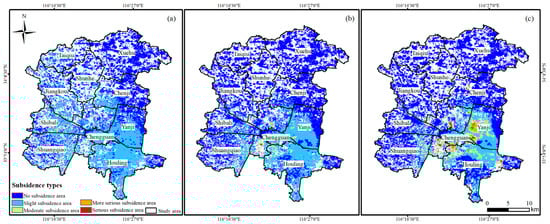 Results after reclassification of foundation subsidence data. (a–c) represent the corresponding subsidence images for 2019–2021, respectively.