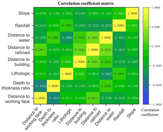 Two indicators, the variance inflation factor () and the tolerance (), were selected to test the multiple covariance of the subsidence-driving factors. Table 2 illustrates that the average values of  and  of the selected driving factors under study are 0.04 and 24.01, respectively, which satisfy  and . The results indicate that there is no covariance between the individual subsidence-driving factors. After further correlation analysis (Figure 5), the absolute values of PCC between the driving factors are less than 0.45. This indicates that there is no problem of redundant information between the selected driving factors, which can be used in the model to judge the real relationship between the driving factors and subsidence.