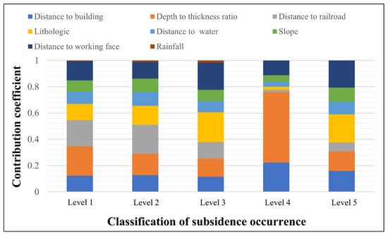 The subsidence was categorized into five grades in this study, and Figure 6 presents the different driving factors’ contribution to each level of subsidence. It is clear from Figure 6 that the four driving factors that contribute most to subsidence as it progresses are depth-to-thickness ratio, distance to the working face, lithology, and distance to buildings. This demonstrates that areas of serious surface subsidence occur mainly in areas with shallow burial depths, with poor stability of the overlying rock strata, and near the working face. Studies have shown that surface deformation is both directly related to the mining thickness and inversely related to the mining depth and that the depth–thickness ratio is the main assessment index for measuring the impact of driving factors on surface subsidence [,]. During coal mining, with the increasing intensity of mining, the surface subsidence of shallow-buried coal seams after mining is very intense, and the subsidence phenomenon is obvious. Moreover, the intensity of surface subsidence in shallow-buried coal seam mining areas is much higher than that in medium–deep-buried coal seam mining areas []. The proportion of coal under buildings is the largest in “Three Down” mining, which means that subsidence mainly occurs close to the working face and away from the building []. Overall, the depth–thickness ratio, the distance to the working face, the distance to the building, and the overburden rock formation play a vital role in subsidence development, with contribution values of 0.242, 0.159, 0.150, and 0.147, respectively. The model incorporates timescales to calculate the contribution of subsidence-driving factors (2019–2020), which makes the results of the calculations more objective. The calculated results of the contribution values are represented as intuitive numerical values, which can be used to quickly identify the key driving factors influencing subsidence changes.