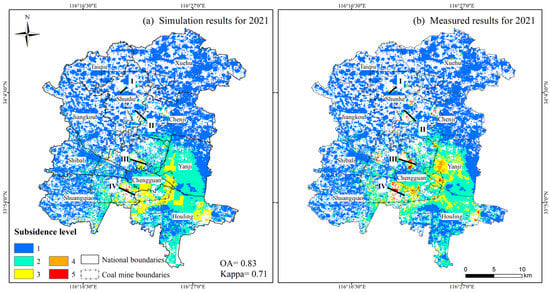 The mining subsidence in 2021 was simulated according to the RF-CA model. In terms of the overall subsidence spatial distribution within the study region, the simulation results are highly consistent with the actual subsidence distribution (Figure 7); the OA is 0.83, and KC is 0.71, indicating that the present method performs well in the simulation of subsidence areas. Although there are some discrepancies, these mainly exist in the urban area, which may be caused by the absence of certain driving factors in the CA model and the spatio-temporal evolution of subsidence in an unnatural state caused by urban planning.