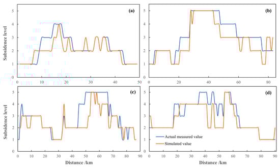 Verification of simulation result accuracy. Numbers 1–5 represent no subsidence, slight subsidence, moderate subsidence, more serious subsidence, and serious subsidence, respectively. I, II, III, and IV represent four cross-sections.