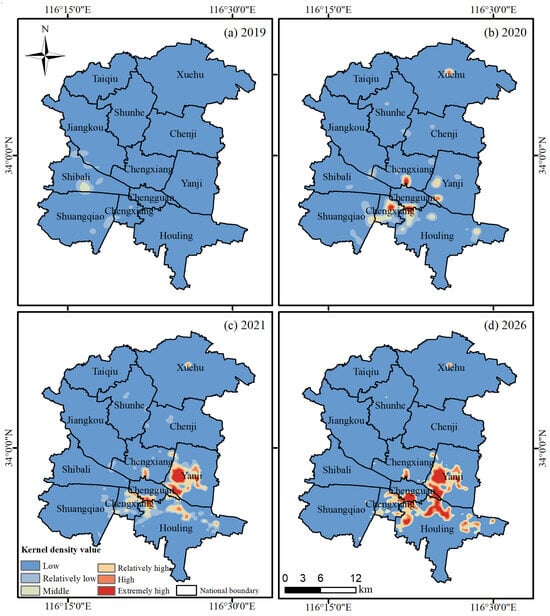 Considering the need for model input, the raster data of the subsidence area were transformed into point data, and a kernel density analysis of the subsidence data in 2019–2021 was carried out to obtain the distribution density characteristics of the subsidence region over all three years (Figure 9). It is clear from Figure 9 that the range of the subsidence region progressively expands over time. The subsidence area is mainly concentrated in Xuehu Town in the north of the study region, Chenji Town in the east, and Chengguan Town, Yanji Town, Houling Town, and Chengxiang Township in the southeast.