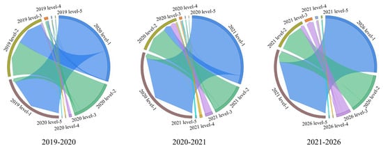 The area transfer trajectories of different subsidence types were analyzed using the chordal graph visualization model. As shown in Figure 10, the area transfer of slight subsidence and moderate subsidence in the study area was most obvious during 2019–2026, with a total area transfer of 23.71 km2 and 7.31 km2 (2019–2020), 19.85 km2 and 23.26 km2 (2020–2021), and 39.13 km2 and 24.19 km2 (2021–2026), respectively. From 2019 to 2021, the development of subsidence was most intense during this period. The areas of more serious subsidence and serious subsidence increased, and the total area transfer of the two types of subsidence was 8.34 km2 and 3.89 km2, respectively. By 2026, the total area transfer of more serious subsidence and serious subsidence is projected to decrease by 0.85 km2 and 0.13 km2, respectively. Though the growth rate of subsidence slows down, subsidence in the region still continues to develop. Considering that coal mining inevitably causes surface subsidence, it is important to formulate a scientific and reasonable surface subsidence prevention and control program to reduce damage from coal mining and for ecological and environmental protection [].