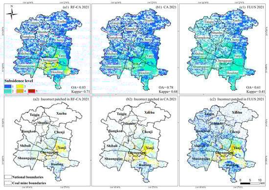Comparison of simulation results obtained using different methods. (a1,b1,c1) are the RF-CA, CA, and FLUS model simulation results, respectively, and 1–5 represent no subsidence, slight subsidence, moderate subsidence, more serious subsidence, and serious subsidence, respectively; (a2,b2,c2) are the mis-simulated regions in the simulation results.