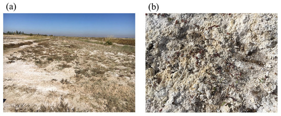 Abandoned saline farmland (a) and its surface (b), photographed in the Hetao Irrigation District of Inner Mongolia, China.