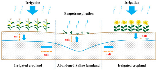 Schematic diagram of a dry drainage system, where the abandoned farmland acts as an evaporation sink with a lower groundwater table. The groundwater and dissolved salts move from the surrounding crop field to the abandoned farmland, which provides a natural-based solution for sustainable farming.