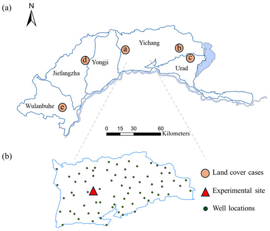 Location of land cover cases and five sub-irrigation districts of the Hetao Irrigation District (a); Location of the experimental site and well locations of the Yichang subdistrict (b).