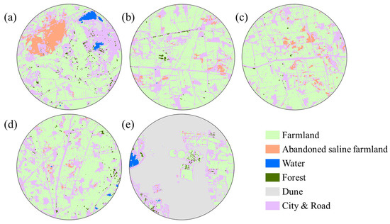 Land cover of five cases with a surface area of 5765 ha. The location of the cases is shown in Figure 3a, where (a) Case in Yichang sub-irrigation district, (b) Case in Yichang sub-irrigation district, (c) Case in Urat sub-irrigation district, (d) Case in Jiefangzha sub-irrigation district, and (e) Case in Wulanbuhe sub-irrigation district.