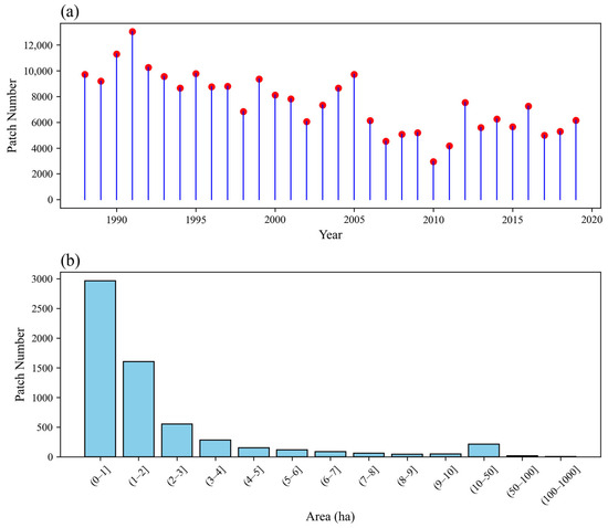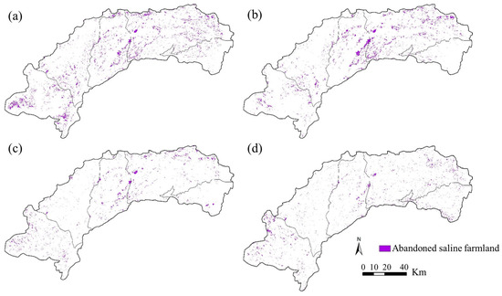The extraction of abandoned saline farmland (Figure 5) is based on the method developed by Zhao et al. [5]. Based on the idea of “elimination” to detect abandoned saline land step by step, more details can be found in [5].
