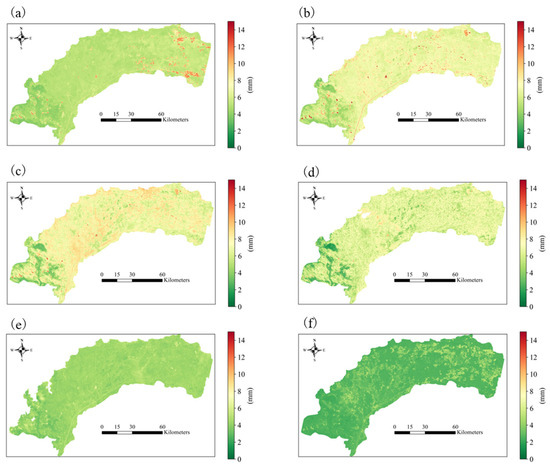 Daily ET map for 2019: (a) 21 April, (b) 8 June, (c) 10 July, (d) 27 August, (e) 28 September, (f) 30 October.