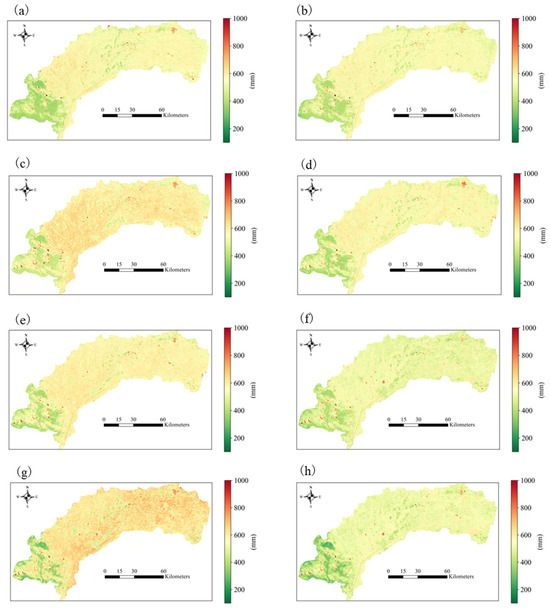 Non-freezing period ET inversion values from 1988 to 2019: (a) 1988, (b) 1993, (c) 1998, (d) 2006, (e) 2011, (f) 2016, (g) 2018, (h) 2019.