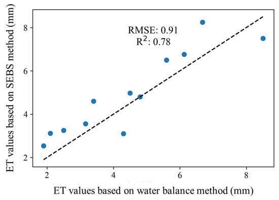 The daily ET calculated based on the daily-scale water balance model was compared with the result by the remote sensing method SEBS. As shown in Figure 8, the coefficient of determination (R2) was 0.78, and the root mean square error (RMSE) was 0.91 mm/day. There are a total of six cloud-free Landsat imageries available at Hetao during the non-freezing season of 2019, which are 21 April, 8 June, 10 July, 27 August, 28 September, and 30 October. As a result, Figure 8 shows twelve validation data points calculated based on the six daily ET maps (Figure 6) at two sites (Figure 3a) using the water balance model. The result shows an R2 of 0.78 and RMSE of 0.91 for the SEBS predicted ET, indicating high accuracy of the ET estimation.