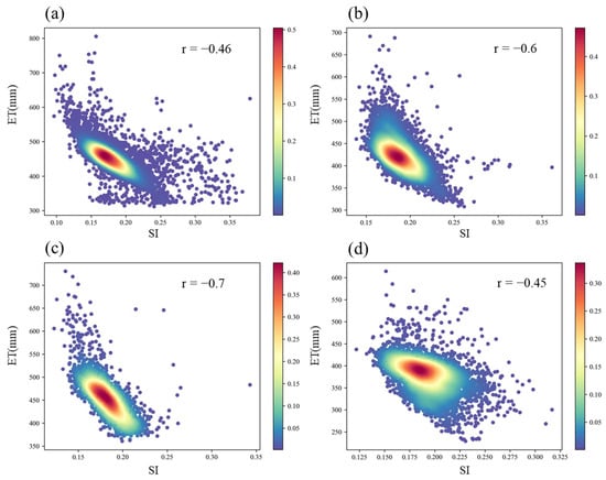 In previous studies, the analysis of the effect of salinization on ET mostly involved measuring ET at different salinity levels and then analyzing its variation [44]. A systematic analysis was conducted using remote sensing methods, and the SI was used to represent the degree of salinization in the region. Applying the conversion formula for SI and soil salinity could achieve the conversion between SI and soil salinity, and more details can be found in [5].