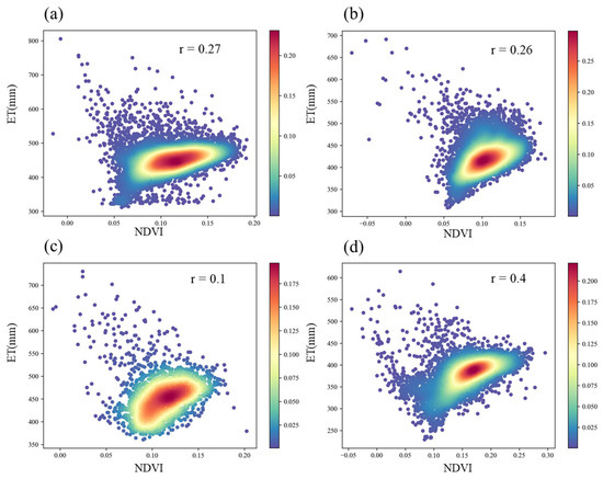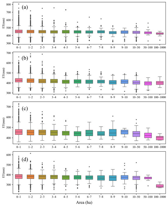 Non-freezing season ET (mm) for different area ranges of abandoned saline farmland in (a) 1990, (b) 1999, (c) 2010, and (d) 2019. The values of the independent variable use left-closed and right-open intervals.