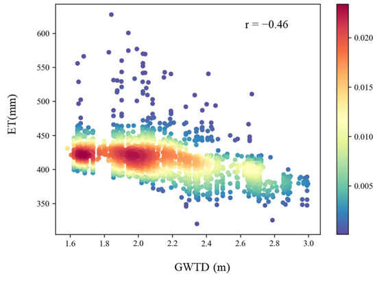 The correlation matrix of ET in abandoned saline farmland with GWTD, AI, NDVI, SI, and the surface area of abandoned saline farmland is shown in the following table (Table 1). According to the table, ET has a slightly negative correlation with GWTD (r = −0.121), suggesting an increase in groundwater depth could slightly reduce ET. The relationship with the AI of abandoned saline farmland is also slightly negative (r = −0.123), indicating that an increase in aggregation could slightly reduce ET. In contrast, ET shows a stronger positive correlation with the NDVI (r = 0.218), meaning increasing vegetation density could increase ET. The relationship between ET and the SI is weakly negative (r = −0.098), suggesting that an increase in salinity could slightly reduce ET. Finally, the relationship between ET and the surface area of abandoned saline farmland is slightly negative (r = −0.096), indicating that an increase in the area could slightly reduce ET. These data reveal the complex relationships between ET in abandoned saline farmland and several environmental factors, with the positive correlation between NDVI and ET being the most significant.