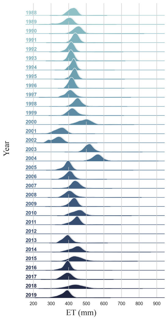 Using the above method, a total of 182 images from 1988 to 2019 were obtained, and ET was calculated for those dates. Due to space limitations, only the results for 2019 are presented here (Figure 6). As shown in Figure 6, daily ET in June, July, and August 2019 reached approximately 10 mm, while in April, it was around 6 mm. In September and October, daily ET generally remained below 5 mm. During the non-freezing period, the regional average ET (Figure 7) ranges mostly between 200 mm and 600 mm.
