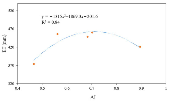 The relationship between AI and ET is based on five landscape cases in the Hetao Irrigation District. The blue dashed line shows the quadratic regression fit.