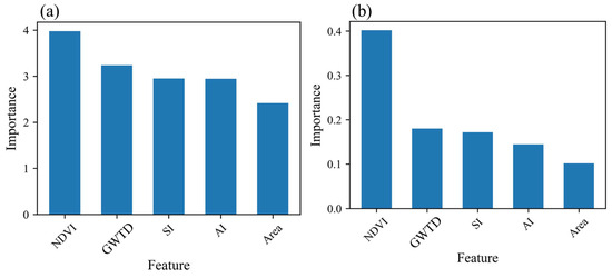 Figure 16 shows the importance of the indices calculated using the Lasso multivariate linear regression and those calculated using the Random Forest regression. The ranking of the importance of the features is consistent for both methods and for all the features, with NDVI being the most important, followed by GWTD, and the influence of the surface area of abandoned saline farmland being the weakest. The differences in the importance of each feature obtained by Lasso regression are smaller. This is because Lasso regression is a linear model and does not capture the high-dimensional interactions between features. In contrast, Random Forest, which is a nonlinear model, includes the high-dimensional interactions between features in its calculation of feature importance. However, both methods only provide a consolidated importance index and cannot determine the uncertainty in the importance of each feature.