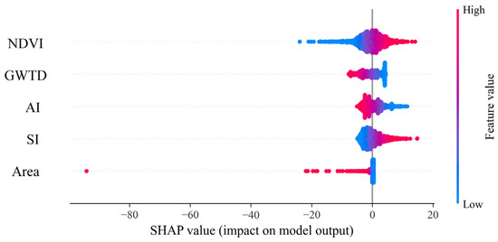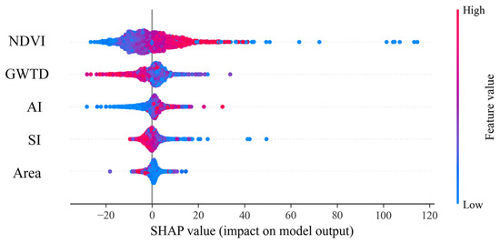 According to Figure 17 and Figure 18, the distribution of Shapley feature importance generated by Lasso shows substantial irregularities except for NDVI, suggesting that linear models may not capture high-dimensional interactions between variables (features). The distribution of Shapley feature importance generated by RF is more consistent with a Gaussian distribution, suggesting a highly nonlinear relationship between abandoned saline farmland ET and various features and that RF can explain some of this nonlinearity. Groundwater depth is the second most important feature after NDVI. This is because the crop transpiration process requires the roots to take up water from the soil in the root zone, and groundwater, which replenishes the unsaturated soil moisture by capillary rise, is an essential source of crop water uptake. The AI of abandoned saline farmland is the third most important feature affecting ET, as the distribution of different landscapes can affect groundwater levels and microclimates, indirectly affecting ET. For example, if the AI of abandoned saline farmland is high, groundwater levels will drop, indirectly reducing ET. The area of abandoned saline farmland does not significantly influence the average ET of these abandoned saline farmland, possible reasons being: (1) training sample imbalance, with a lack of samples from large abandoned saline farmlands; (2) substantial spatial variability in the study area; (3) groundwater levels in abandoned saline farmlands were below the critical depth, where groundwater could not produce capillary rise, leading to ET being mainly controlled by rainfall.