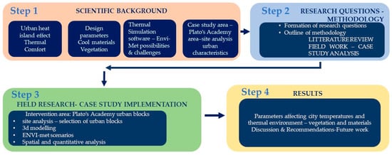 As shown in Figure 1, the methodology followed involves four key steps. Firstly, a literature review on a number of different topics occurs, such as urban heat island effect and thermal comfort, design parameters implemented at the neighborhood scale and more specifically cool materials and vegetation, study on the possibilities and challenges of the selected simulation software, i.e., ENVI-Met an investigation on the case study area in terms of urban characteristics. This context highlights the potential for understanding the neighborhood scale through the systematic recording of different design parameters. In the second step, the research’s objective is identified and the research questions (RQs) are addressed. In the third step, the results of the review are implemented in a historical case study area of the city of Athens. Finally, based on the analysis of the case study, the most significant factors affecting neighborhood thermal performance are identified and analyzed. Discussion and future work complete the outline of the work.
