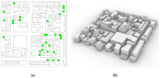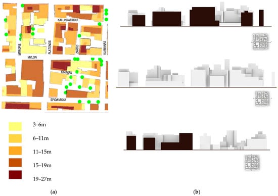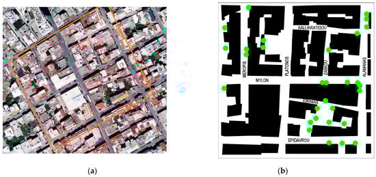 Case study area of Acadimia Platonos. (a) Case study simulation area marked in red; (b) built to unbuilt area (green dots represent the existing vegetation).