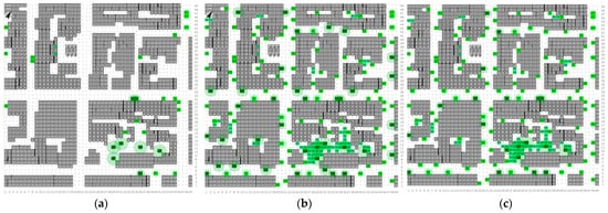 Vegetation maps. (a) Implementation of existing vegetation in S1 and S2 Scenarios, (b) implementation of high vegetation in S3 and S5 Scenarios and (c) implementation of low vegetation in S4 Scenario (see Table A3 in the Appendix A and Appendix B section).