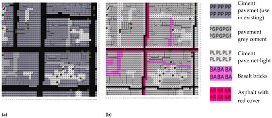 Ground cover material maps. (a) Implementation of existing materials in S1, S3 and S4 Scenarios; (b) implementation of cool materials in S2 and S5 Scenarios.