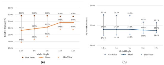 Relative humidity measured vertically in the existing model for (a) 14:00 and (b) 20:00 afternoon.