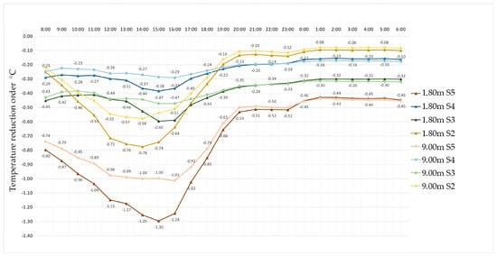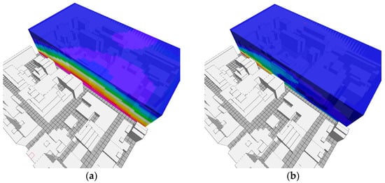 However, observing the simulation results for the different alternative implementation models and processing the results from the receivers, it is clear that the air temperature evolves in the same way in all implementation scenarios both during the day and for the different altitude information levels (Figure 7 and Figures 9–12). In particular, the temperature seems to increase from morning to noon with the maximum values of this temperature being found at 14:00–15:00 at noon, and subsequently, the temperature starts to decrease after 15:00 for both the lower altitude levels of the model and the higher altitude levels.