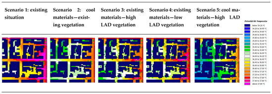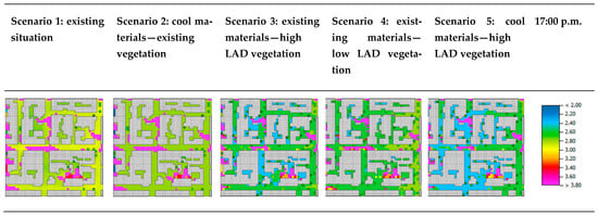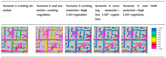 According to related studies, it is concluded that the higher the LAD index, the higher will be the effect on the microclimate, with a direct decrease in the outdoor temperature [,,]. For this reason, the vegetation selected in the third scenario together with the materials selected in the second scenario compose the last scenario (S5-s), as the optimal scenario.