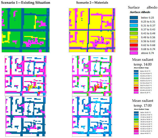 The building materials of the existing situation (Scenario 1) were used in Scenarios 3 and 4. For Scenarios 2 and 5 the above-mentioned materials were replaced by cool materials where the incident radiation on these surfaces is reflected. The high reflectivity of cool materials contributes to both lower absorption of solar radiation and easier dissipation of heat, therefore resulting in lower surface temperatures.