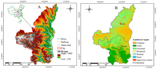 The geographical location’s altitude (A) and landcover types (B) in the NSLP.