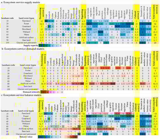 Ecosystem services supply (a), demand (b), and balance (c) matrices across various land cover types from 2000 to 2020.