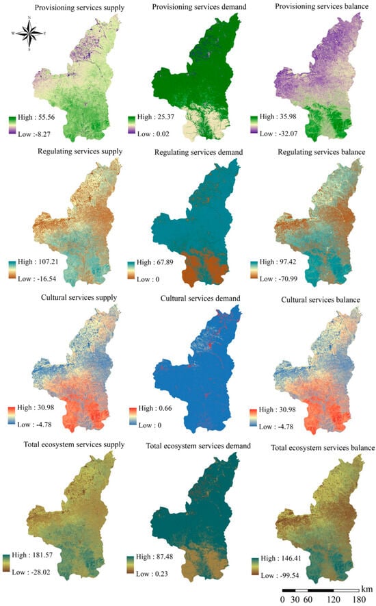 Spatial characteristics of provisioning services, regulating services, cultural services, and total ecosystem service supply, demand, and balance in the NSLP in 2020 (×106 m2).