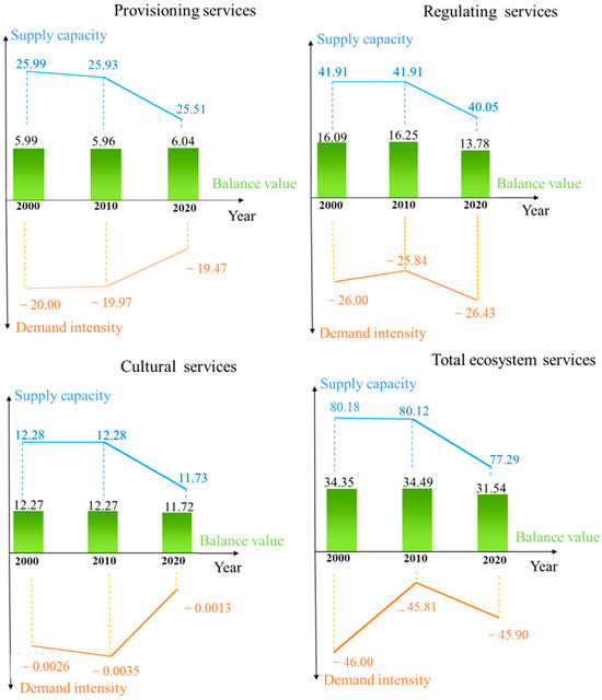 Temporal changes in provisioning services, regulating services, cultural services, and total ecosystem service supply, demand, and balance from 2000 to 2020.