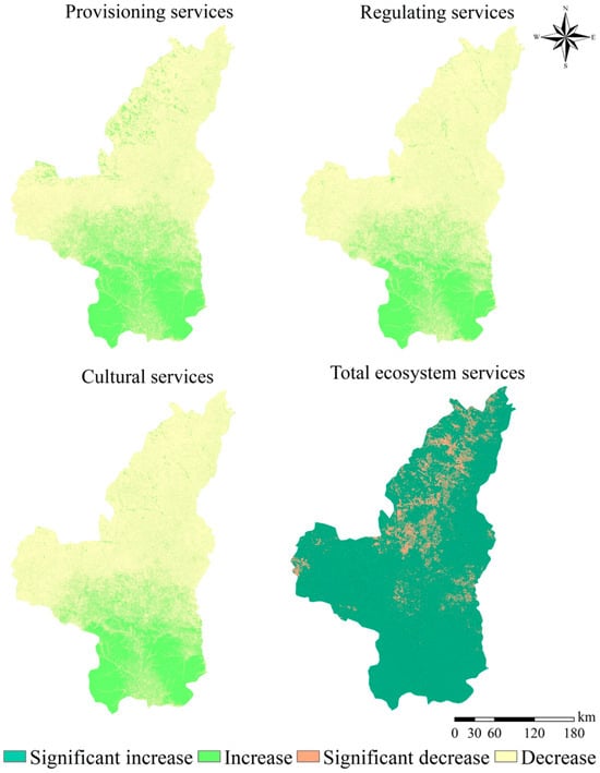 Spatial pattern of the change trend in provisioning services, regulating services, cultural services, and total ecosystem service balance from 2000 to 2020.