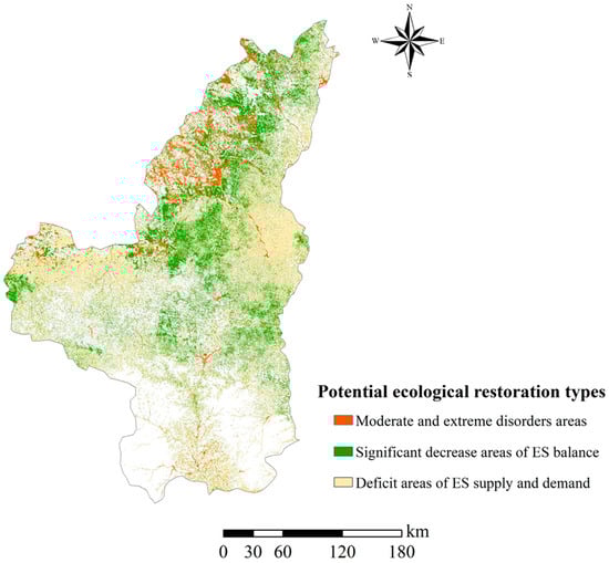To address the degradation of regional ecosystems and restore damaged ecological spaces, this study identified potential ecological restoration areas in the NSLP based on the assessment of ES supply and demand and the coupling coordination degree. The judgment was that areas where ES balance was less than 0 and areas where the coupling between ES supply and demand was moderate and extreme disorder were regarded as ecosystem damage restoration areas (Table 3).