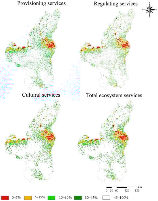 Spatial patterns of ecological restoration priority areas of provisioning services, regulating services, cultural services, and total ecosystem services in the NSLP.